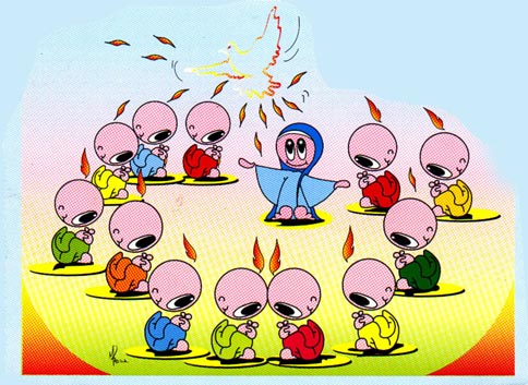 “C’è molta gemte a Gerusalemme, venuta anche da lontano. E’ la festa di Pentecoste. Gli ebrei ringraziano il Signore per il dono dell’alleanza e per le spighe ormai mature. Maria e gli apostoli sono riuniti in preghiera nella sala, dove è apparso Gesù risorto. All’improvviso viene dal cielo un rumore grande come il vento impetuoso. Appaiono lingue di fuoco, che si posano su ciascuno di loro ed essi sono tutti pieni di Spirito Santo.”