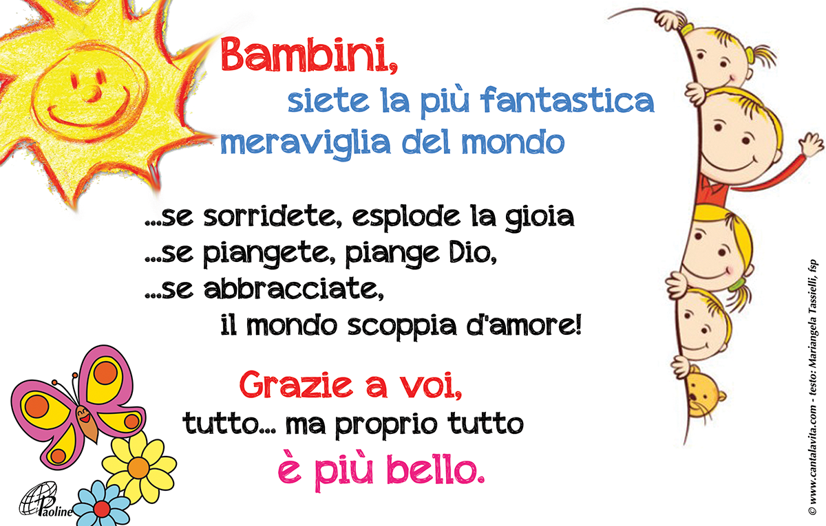 Chi di noi ama i piccoli, deve dare e comunicare amore, stima, affetto. Troppo spesso le nostre intenzioni verso di loro restano tali. Il tempo passa, loro crescono, ma noi non ci siamo, né per una pacca sulle spalle, né per dire: “Ti voglio bene!” E allora facciamolo, ora, in vista del Natale.