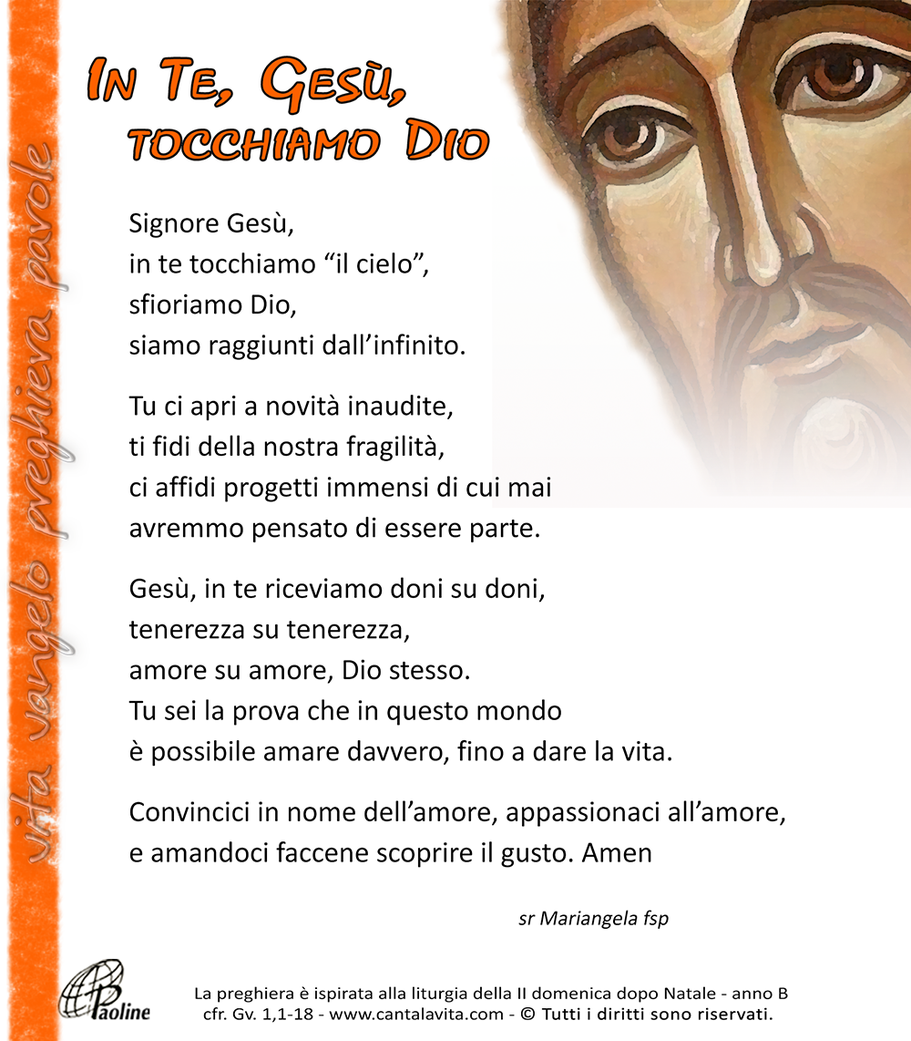 Signore Gesù, in te tocchiamo “il cielo”, sfioriamo Dio, siamo raggiunti dall’infinito. Tutta l’esistenza è stravolta, ogni certezza rivoluzionata: ci apri a novità inaudite, ti fidi della nostra fragilità, ci affidi progetti immensi di cui mai avremmo pensato di essere parte. Gesù, in te riceviamo doni su doni, tenerezza su tenerezza, amore su amore, Dio stesso. Tu sei la prova che in questo mondo è possibile amare davvero, fino in fondo, fino a dare la vita. Convincici in nome dell’amore, appassionaci all’amore, e amandoci faccene scoprire il gusto. Amen