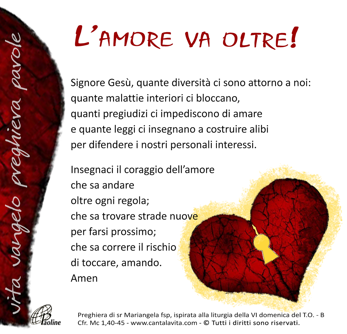 L’amore non accetta e non conosce giustificazioni, non comprende ritardi e superficialità nel bene, non si dà ragione di fronte alla paura del diverso. L’amore sa di essere il senso vero di ogni legge, la possibilità concreta di ogni esistenza: tocca, accarezza, guarisce, salva.
