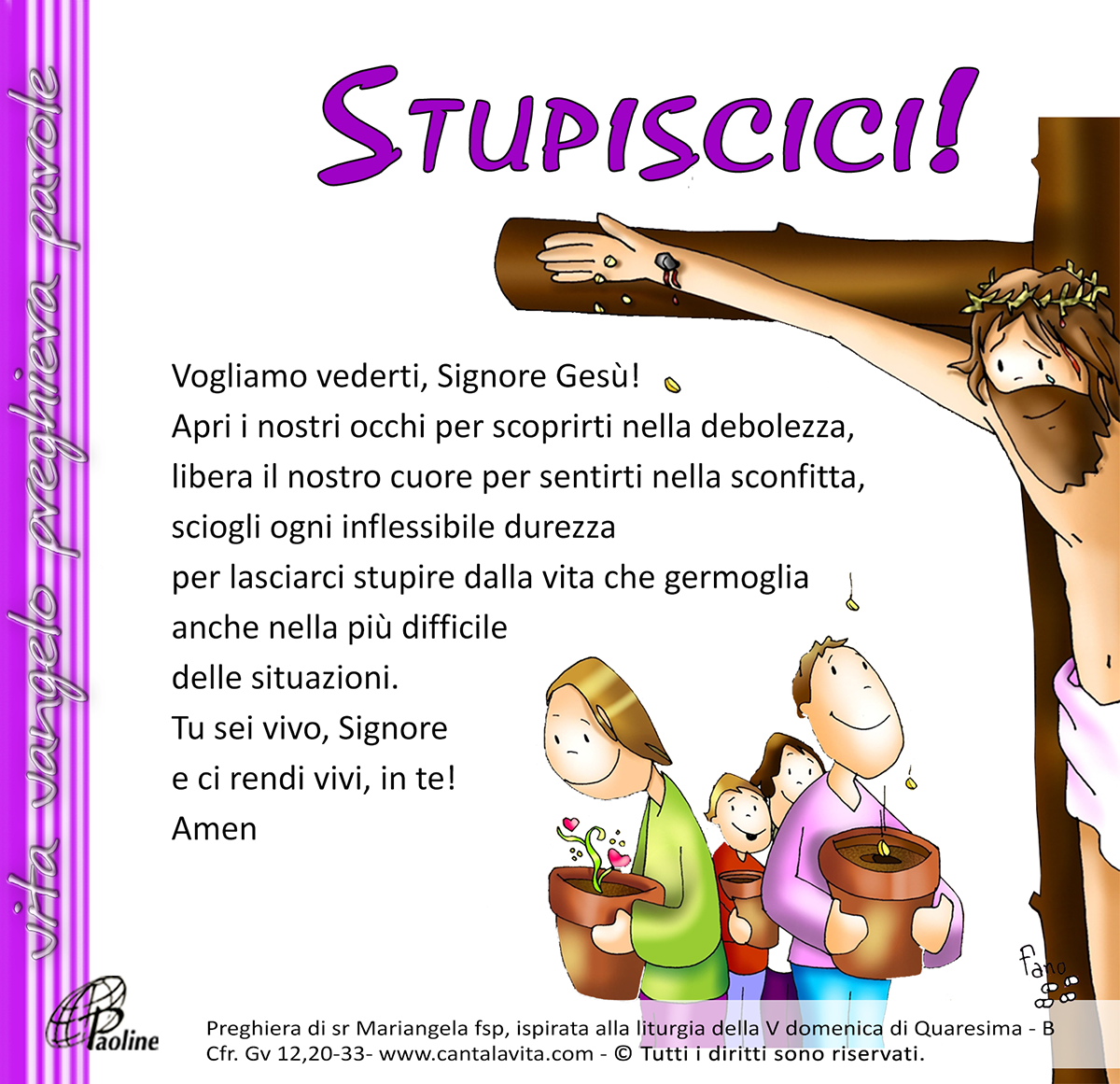 Vogliamo vederti, Signore Gesù! Apri i nostri occhi per scoprirti nella debolezza, libera il nostro cuore per sentirti nella sconfitta, sciogli ogni inflessibile durezza per lasciarci stupire dalla vita che germoglia anche nella più difficile delle situazioni. Tu sei vivo, Signore e ci rendi vivi, in te! Amen