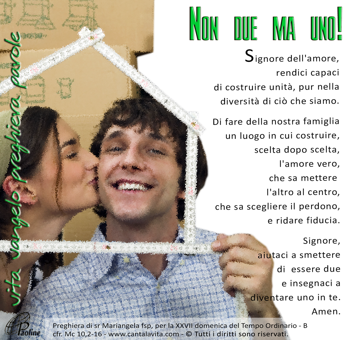 «l’uomo lascerà suo padre e sua madre e si unirà a sua moglie e i due diventeranno una carne sola [...] Dunque l’uomo non divida quello che Dio ha congiunto». (Mc 10,2-16)