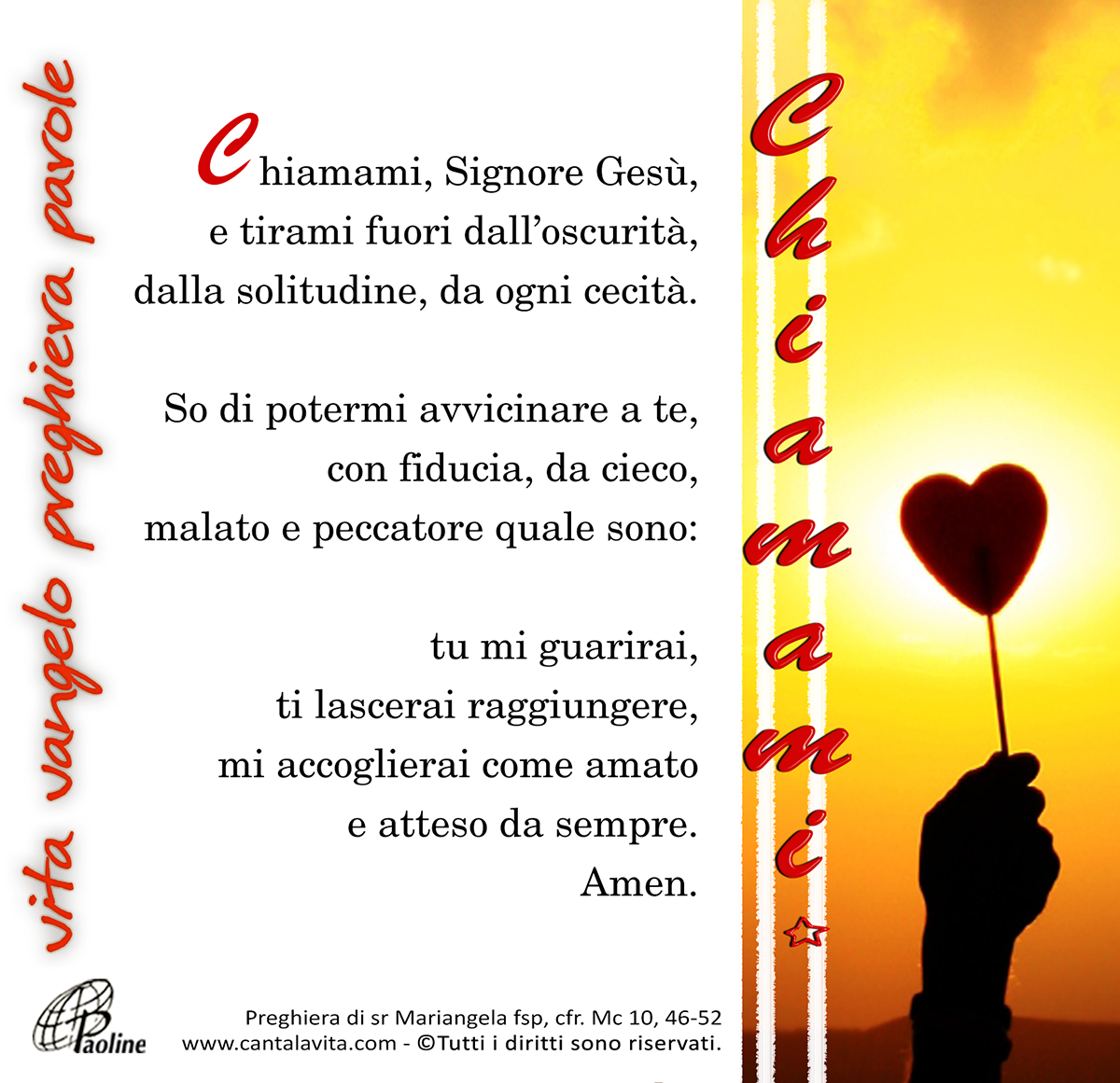 Gesù si fermò e disse: «Chiamatelo!». Chiamarono il cieco, dicendogli: «Coraggio! Àlzati, ti chiama!». Egli, gettato via il suo mantello, balzò in piedi e venne da Gesù.