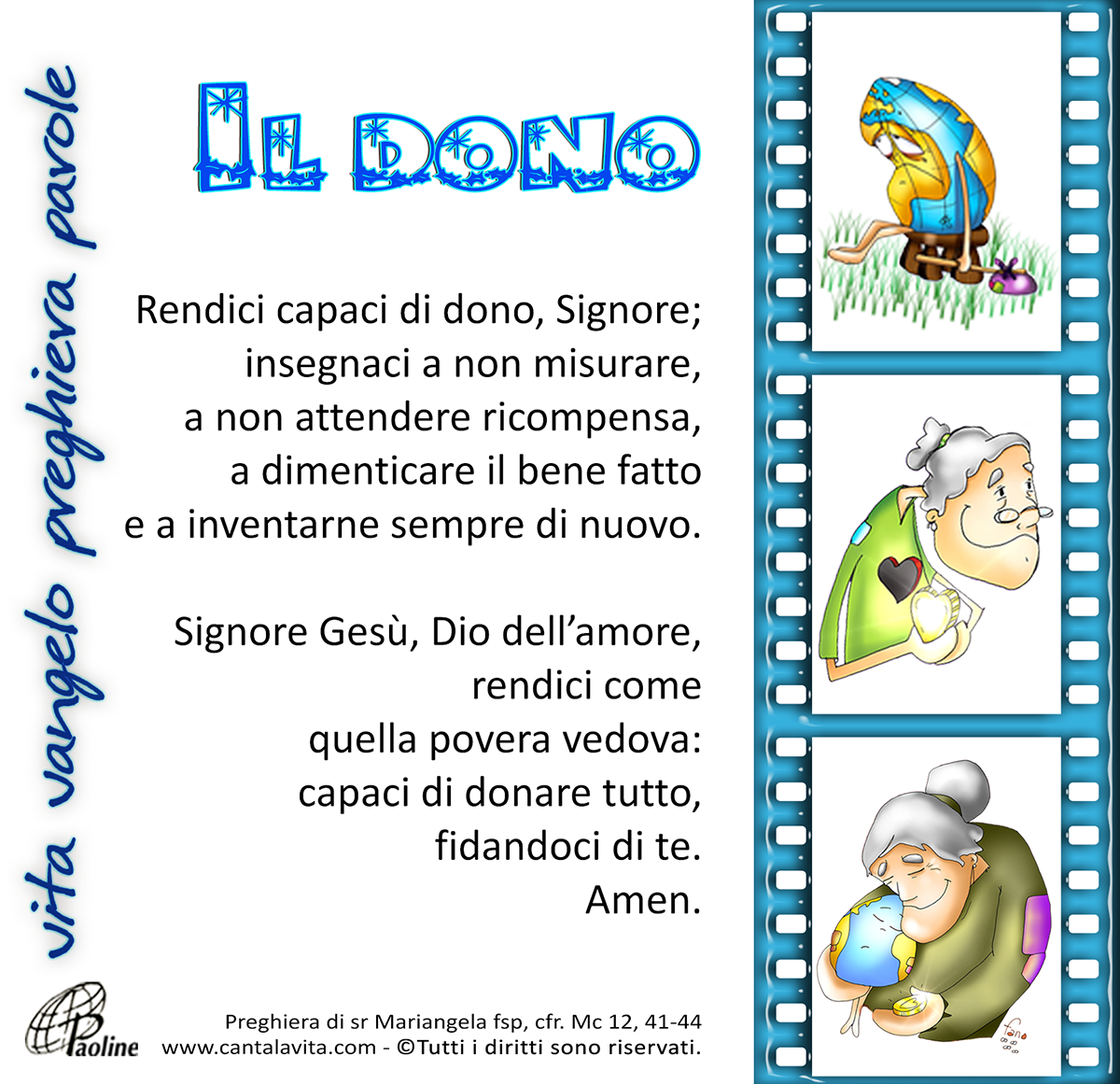 Allora, chiamati a sé i suoi discepoli, disse loro: «In verità io vi dico: questa vedova, così povera, ha gettato nel tesoro più di tutti gli altri. Tutti infatti hanno gettato parte del loro superfluo. Lei invece, nella sua miseria, vi ha gettato tutto quello che aveva, tutto quanto aveva per vivere».