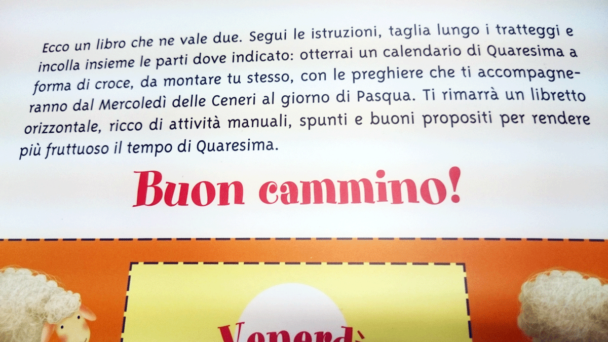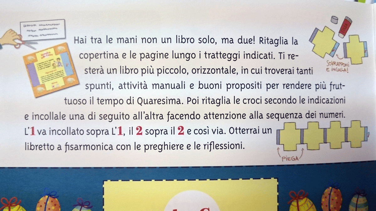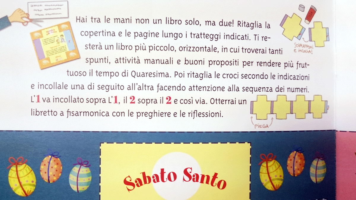 È un libro che ne vale due perché, seguendo le istruzioni e ritagliando la copertina e le pagine lungo i tratteggi indicati, si ottiene un libro a fisarmonica a forma di croce e un libriccino più piccolo, orizzontale, in cui si trovano tanti suggerimenti, lavoretti e riflessioni per rendere più fruttuoso il tempo di Quaresima, Settimana Santa e Pasqua.