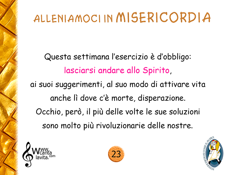 Questa settimana l’esercizio è d’obbligo: lasciarsi andare allo Spirito, ai suoi suggerimenti, al suo modo di attivare vita anche lì dove c’è morte, disperazione.