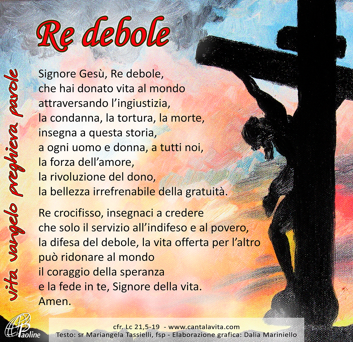 Un re debole, ecco chi è colui in cui siamo chiamati a credere. Un re mite che, a prezzo della sua vita, ha salvato tutti. Un re, la cui croce, è divenuta la voce di condanna di ogni religiosità usata come arma di potere e di condanna.
