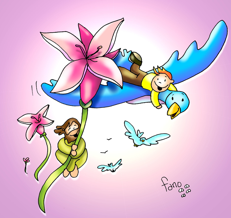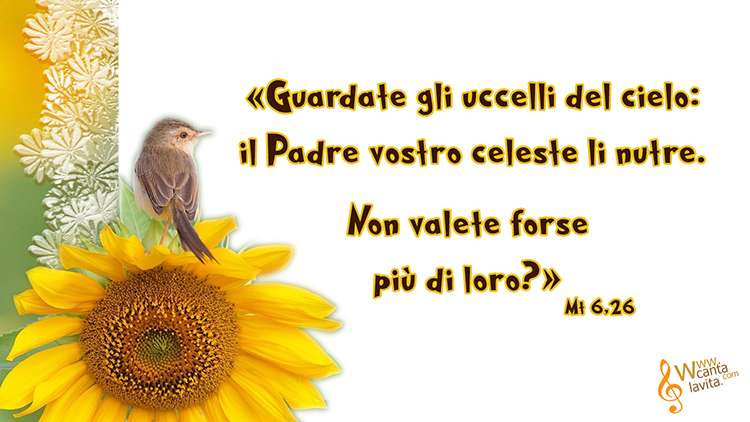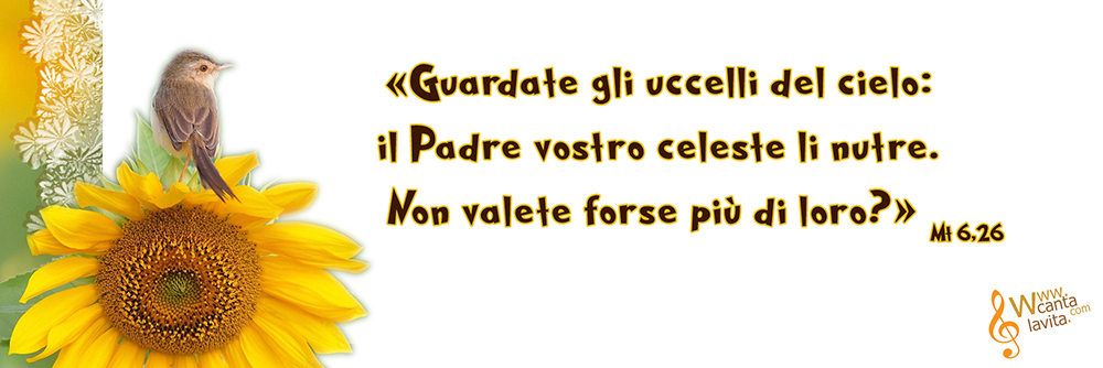 uccellino girasole fioreE per il vestito, perché vi preoccupate? Osservate come crescono i gigli del campo: non faticano e non filano. Eppure io vi dico che neanche Salomone, con tutta la sua gloria, vestiva come uno di loro. Ora, se Dio veste così l’erba del campo, che oggi c’è e domani si getta nel forno, non farà molto di più per voi, gente di poca fede?