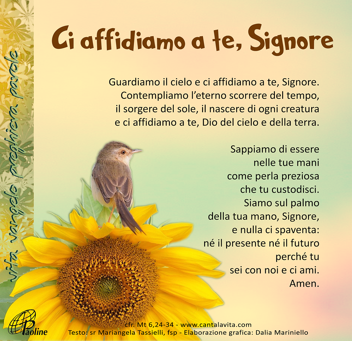 GUIDA O CELEBRANTE: Gesù ci parla di Dio e ci fa scoprire il suo volto, il suo amore, la sua cura e attenzione per la nostra vita. È Dio che si preoccupa di noi e di ciò di cui abbiamo bisogno. Dio ci vuole sereni e capaci di affidarci a lui. Diciamogli allora, tutti insieme: Signore, insegnaci ad affidarci a te.