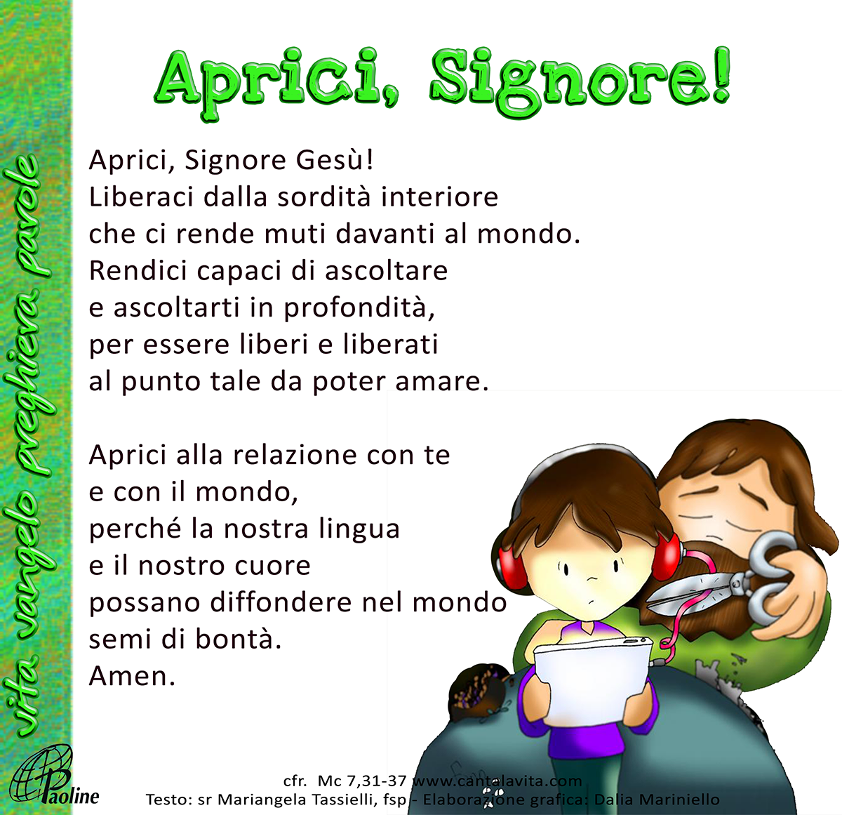 Gli portarono un sordomuto e lo pregarono di imporgli la mano. Lo prese in disparte, lontano dalla folla, gli pose le dita negli orecchi e con la saliva gli toccò la lingua; guardando quindi verso il cielo, emise un sospiro e gli disse: «Effatà», cioè: «Apriti!». E subito gli si aprirono gli orecchi, si sciolse il nodo della sua lingua e parlava correttamente.