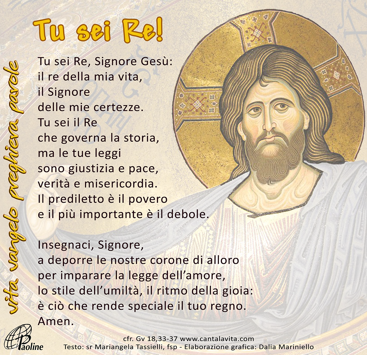 «Tu sei Re!», «Noi ti proclamiamo re», «Davanti al Re, ci inchiniamo insieme»… sono tante le espressioni che ci aiutano a pregare, a contemplare, a riconoscere in Gesù il Re dell’universo. Ma siamo esseri umani, dominio e prevaricazione riescono a scorrere sempre un po’ nelle nostre vene, e allora queste espressioni rischiano, se non sono coltivate in un cuore puro e capace di ascolto profondo, di trasformarsi in convinzione pericolose.