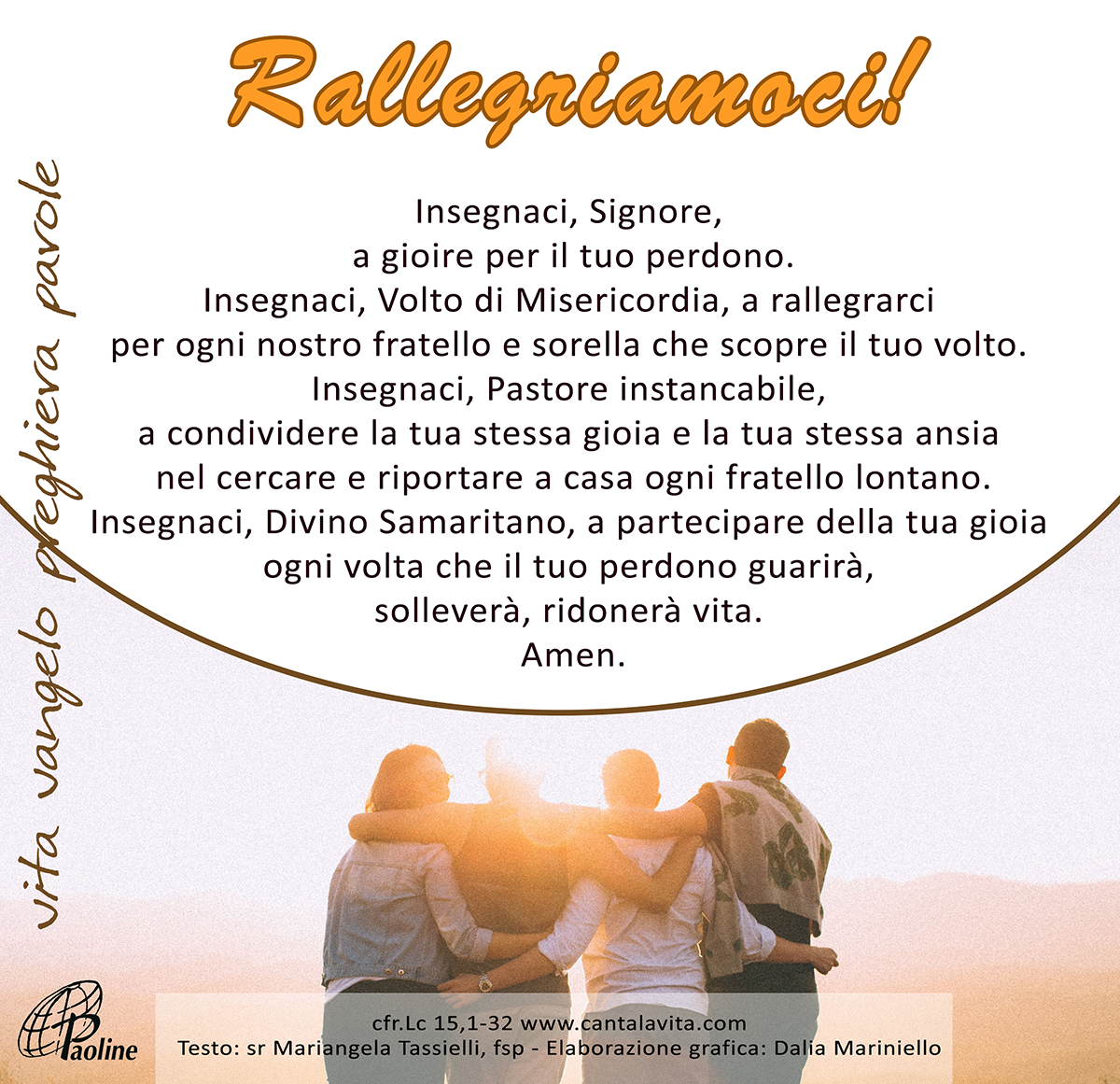 le tre parabole. È come se Luca ci dicesse: Dio perdona, perdona anche ciò che ai nostri occhi è imperdonabile, e di questo dovremmo rallegrarci, gioire, provare una profonda felicità interiore. Il pastore invita a partecipare della sua gioia dopo aver trovato la pecora girovaga. La donna invita a partecipare della sua gioia dopo aver trovato la sua preziosa moneta, che di fatto condividerà con gli altri festeggiando. Il padre invita il figlio a condividere la sua stessa gioia e lo fa con toni decisi, quasi a dirgli: «No, figlio. Se sei davvero fratello non puoi non rallegrarti, non puoi lasciar spazio all’invidia, all’indignazione. Non puoi!». Ritrovare un fratello perduto, vederlo risorgere da una situazione di morte, scoprire sulla sua pelle la sanante carezza del perdono di Dio non può non farti saltare dalla gioia.