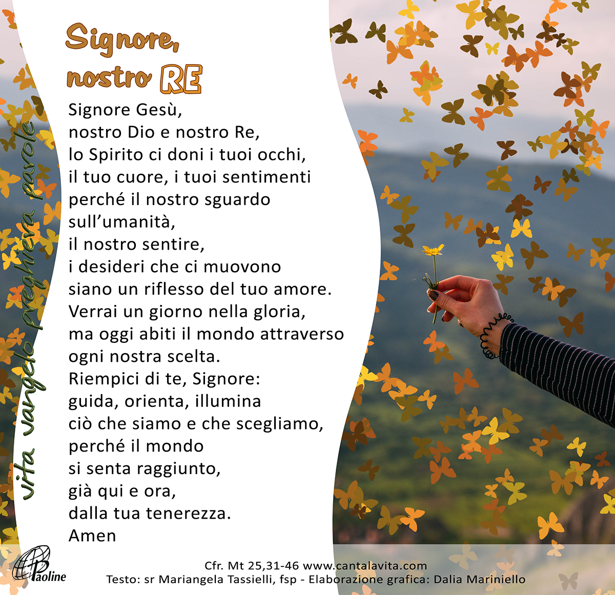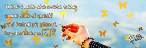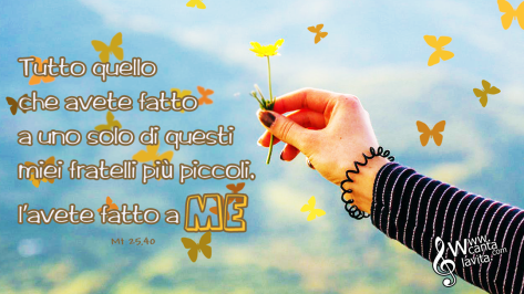 Allora i giusti gli risponderanno: “Signore, quando ti abbiamo visto affamato e ti abbiamo dato da mangiare, o assetato e ti abbiamo dato da bere? Quando mai ti abbiamo visto straniero e ti abbiamo accolto, o nudo e ti abbiamo vestito? Quando mai ti abbiamo visto malato o in carcere e siamo venuti a visitarti?”. E il re risponderà loro: “In verità io vi dico: tutto quello che avete fatto a uno solo di questi miei fratelli più piccoli, l’avete fatto a me”.