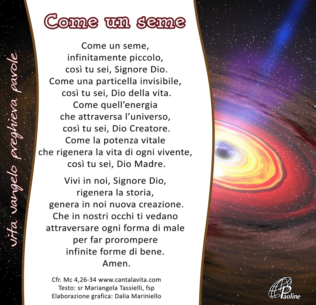 Diceva: «A che cosa possiamo paragonare il regno di Dio o con quale parabola possiamo descriverlo? È come un granello di senape che, quando viene seminato sul terreno, è il più piccolo di tutti i semi che sono sul terreno; ma, quando viene seminato, cresce e diventa più grande di tutte le piante dell’orto e fa rami così grandi che gli uccelli del cielo possono fare il nido alla sua ombra».
