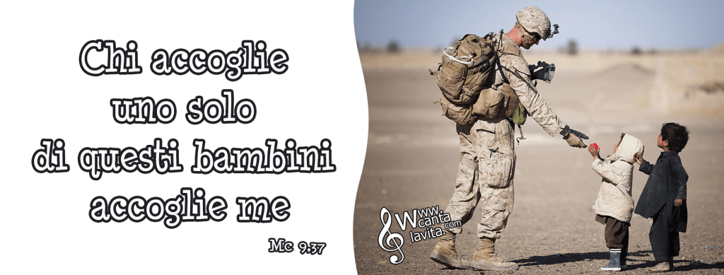 E, preso un bambino, lo pose in mezzo a loro e, abbracciandolo, disse loro: «Chi accoglie uno solo di questi bambini nel mio nome, accoglie me; e chi accoglie me, non accoglie me, ma colui che mi ha mandato».