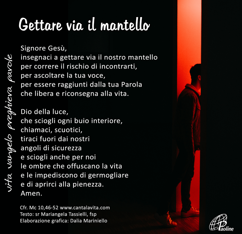 Bartimeo è cieco, non vede, ma la vita gli ha insegnato a chiedere. Lo ha messo sì in un angolo, ma Bartimeo ha un mantello: è ciò che lo protegge dal vento del deserto, dall’acqua improvvisa, dalla polvere della strada. E il suo mantello è la sua casa.