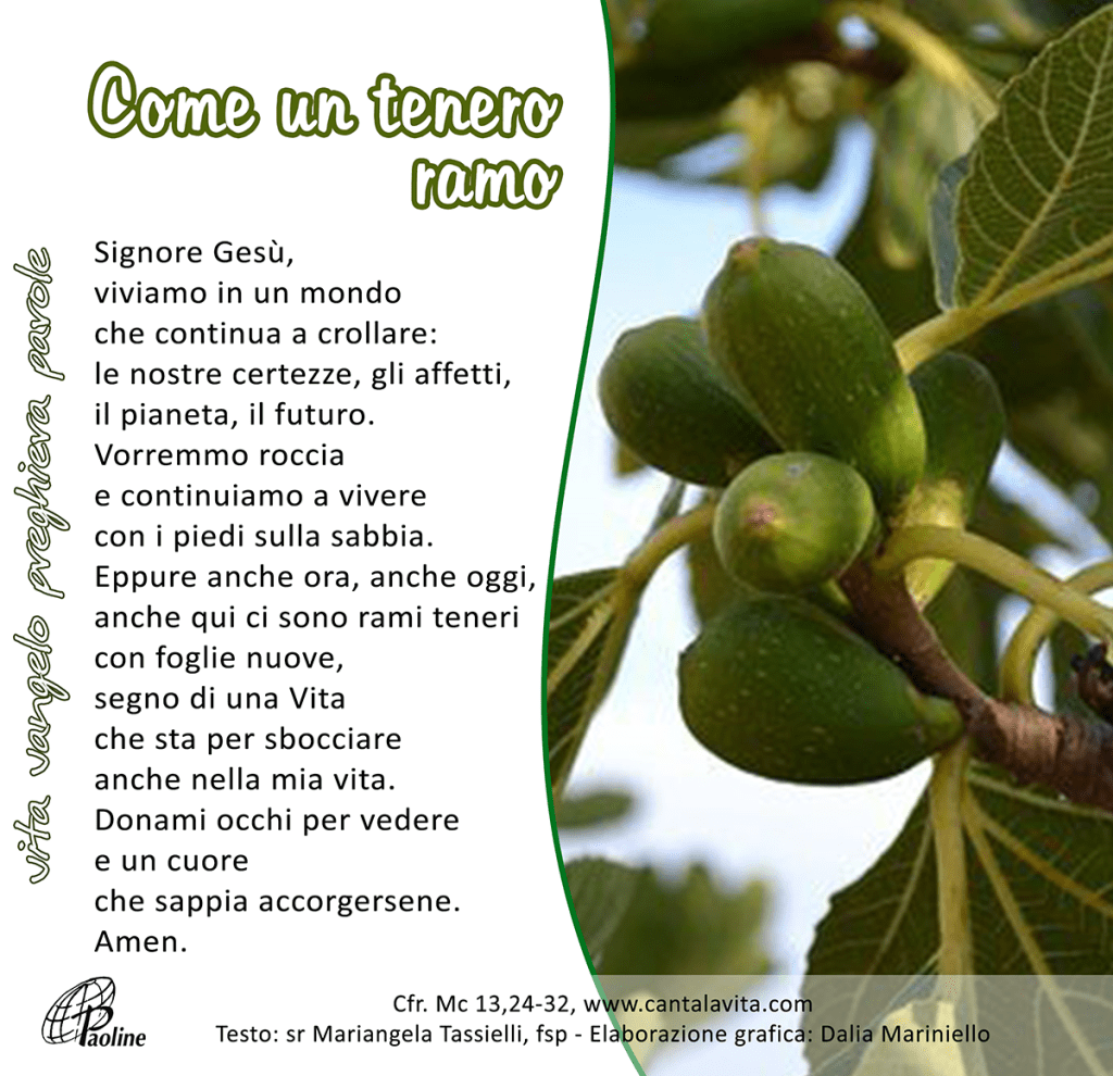 Dalla pianta di fico imparate la parabola: quando ormai il suo ramo diventa tenero e spuntano le foglie, sapete che l’estate è vicina. Così anche voi: quando vedrete accadere queste cose, sappiate che egli è vicino, è alle porte.