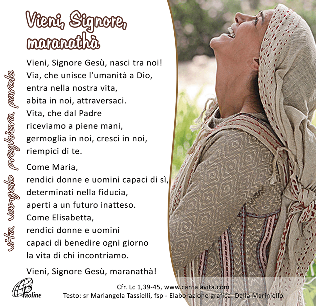 Entrata nella casa di Zaccarìa, salutò Elisabetta. Appena Elisabetta ebbe udito il saluto di Maria, il bambino sussultò nel suo grembo. Elisabetta fu colmata di Spirito Santo ed esclamò a gran voce: «Benedetta tu fra le donne e benedetto il frutto del tuo grembo! A che cosa devo che la madre del mio Signore venga da me? Ecco, appena il tuo saluto è giunto ai miei orecchi, il bambino ha sussultato di gioia nel mio grembo. E beata colei che ha creduto nell’adempimento di ciò che il Signore le ha detto».