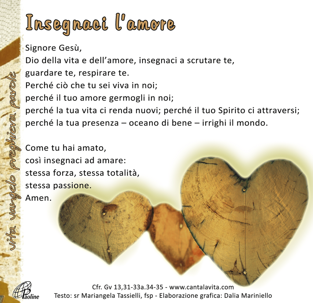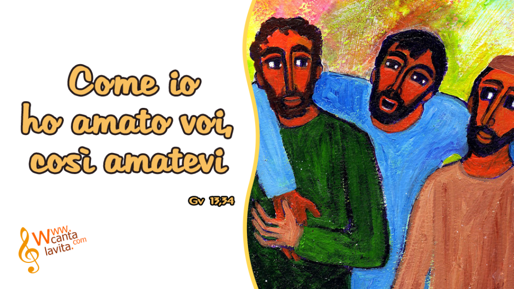 Figlioli, ancora per poco sono con voi. Vi do un comandamento nuovo: che vi amiate gli uni gli altri. Come io ho amato voi, così amatevi anche voi gli uni gli altri.