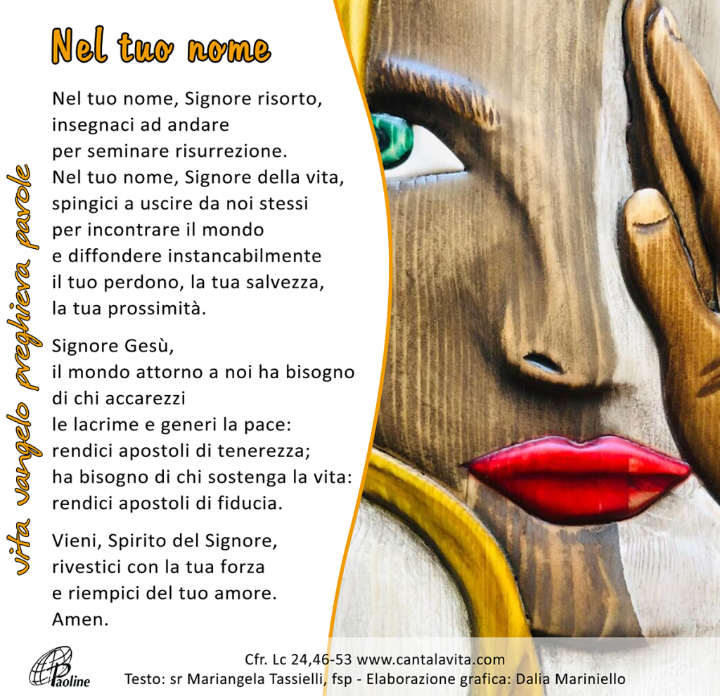 In quel tempo, Gesù disse ai suoi discepoli: «Così sta scritto: il Cristo patirà e risorgerà dai morti il terzo giorno, e nel suo nome saranno predicati a tutti i popoli la conversione e il perdono dei peccati, cominciando da Gerusalemme. Di questo voi siete testimoni. Ed ecco, io mando su di voi colui che il Padre mio ha promesso; ma voi restate in città, finché non siate rivestiti di potenza dall’alto».