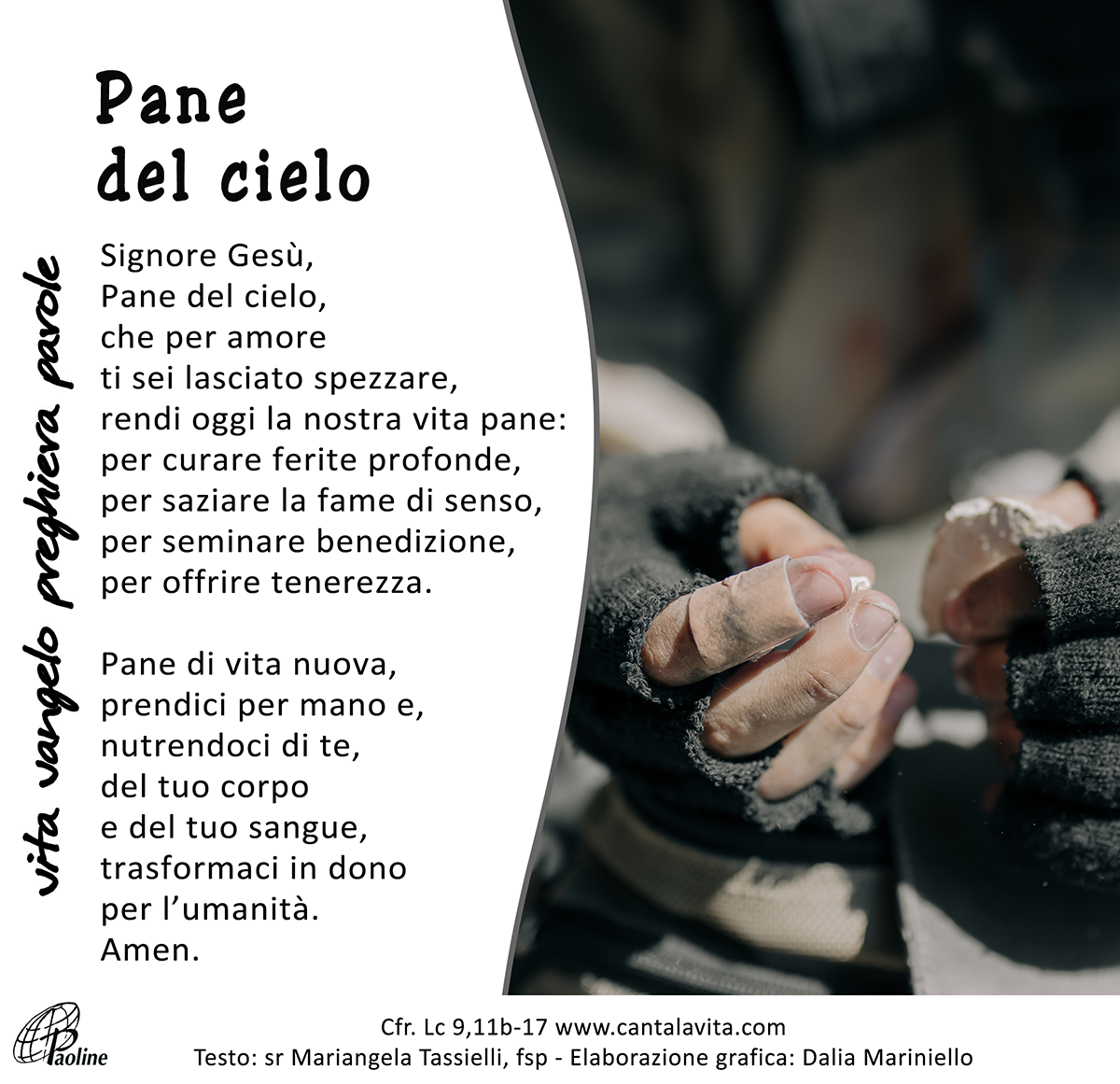 Gerusalemme, dal cenacolo al Golgota, è il luogo in cui il Pane si lascia prendere, spezzare, donare. È lì, in quel dono incondizionato, che prendono forza le parole pronunciate alle folle affamate. Quelle che la liturgia oggi ci rioffre: «Voi stessi date loro da mangiare». Parole pronunciate per i Dodici, di fronte alle folle che seguivano quel maestro per sentirlo parlare del regno di Dio e per essere da lui curati. Curati, dice l’evangelista, non guariti. Perché questo fa il pane: cura. E cura nel momento in cui viene spezzato.