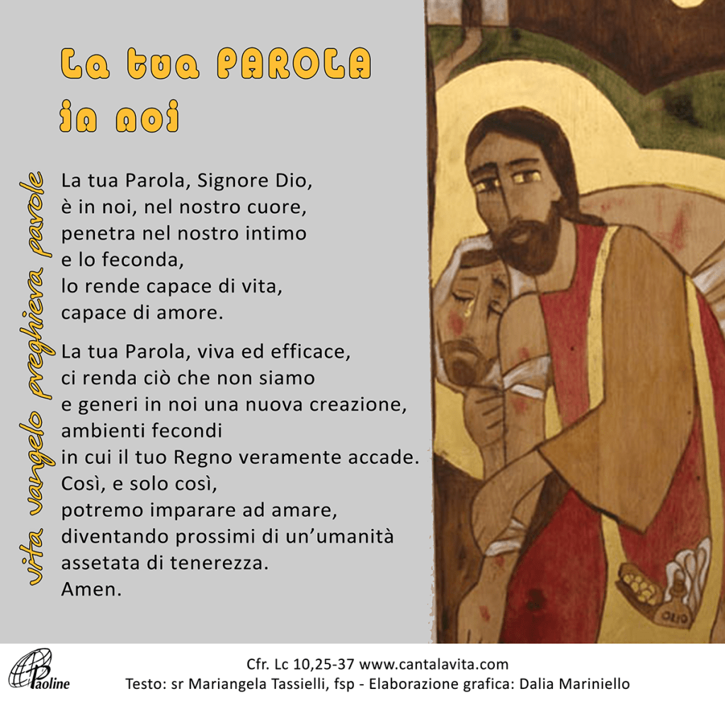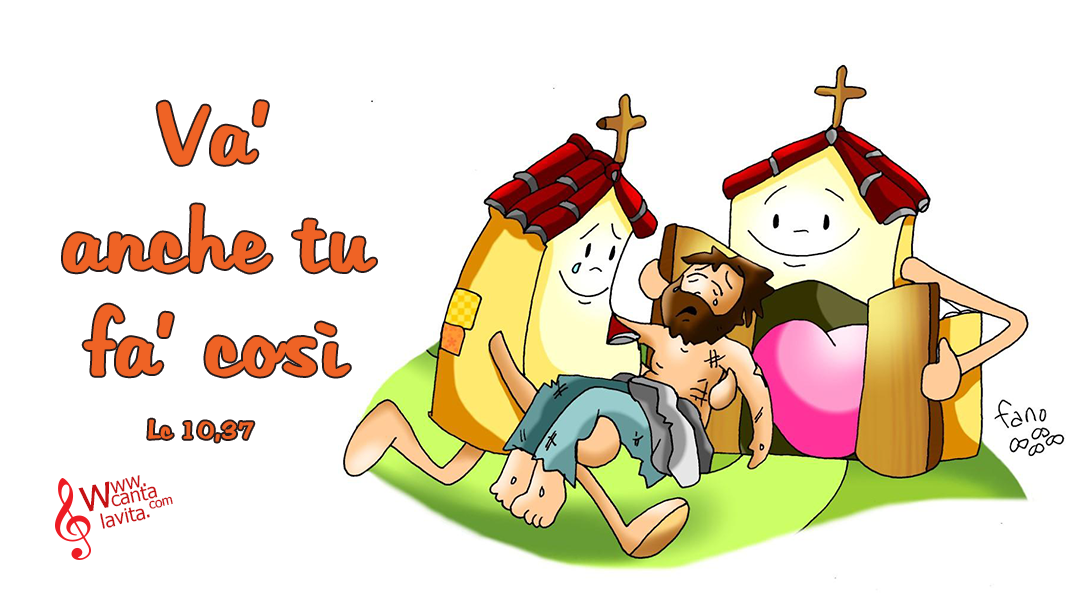 Ma quello, volendo giustificarsi, disse a Gesù: «E chi è mio prossimo?». Gesù riprese: «Un uomo scendeva da Gerusalemme a Gèrico e cadde nelle mani dei briganti, che gli portarono via tutto, lo percossero a sangue e se ne andarono, lasciandolo mezzo morto. Per caso, un sacerdote scendeva per quella medesima strada e, quando lo vide, passò oltre. Anche un levìta, giunto in quel luogo, vide e passò oltre. Invece un Samaritano, che era in viaggio, passandogli accanto, vide e ne ebbe compassione. Gli si fece vicino, gli fasciò le ferite, versandovi olio e vino; poi lo caricò sulla sua cavalcatura, lo portò in un albergo e si prese cura di lui. Il giorno seguente, tirò fuori due denari e li diede all’albergatore, dicendo: “Abbi cura di lui; ciò che spenderai in più, te lo pagherò al mio ritorno”. Chi di questi tre ti sembra sia stato prossimo di colui che è caduto nelle mani dei briganti?». Quello rispose: «Chi ha avuto compassione di lui». Gesù gli disse: «Va’ e anche tu fa’ così».