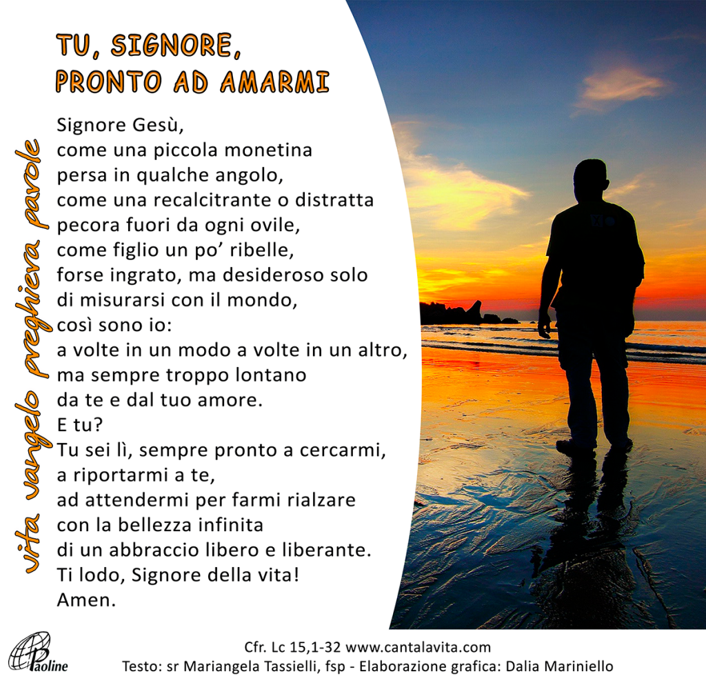 Disse ancora: «Un uomo aveva due figli. Il più giovane dei due disse al padre: “Padre, dammi la parte di patrimonio che mi spetta”. Ed egli divise tra loro le sue sostanze. Pochi giorni dopo, il figlio più giovane, raccolte tutte le sue cose, partì per un paese lontano e là sperperò il suo patrimonio vivendo in modo dissoluto. Quando ebbe speso tutto, sopraggiunse in quel paese una grande carestia ed egli cominciò a trovarsi nel bisogno. Allora andò a mettersi al servizio di uno degli abitanti di quella regione, che lo mandò nei suoi campi a pascolare i porci. Avrebbe voluto saziarsi con le carrube di cui si nutrivano i porci; ma nessuno gli dava nulla. Allora ritornò in sé e disse: “Quanti salariati di mio padre hanno pane in abbondanza e io qui muoio di fame! Mi alzerò, andrò da mio padre e gli dirò: Padre, ho peccato verso il Cielo e davanti a te; non sono più degno di essere chiamato tuo figlio. Trattami come uno dei tuoi salariati”. Si alzò e tornò da suo padre.