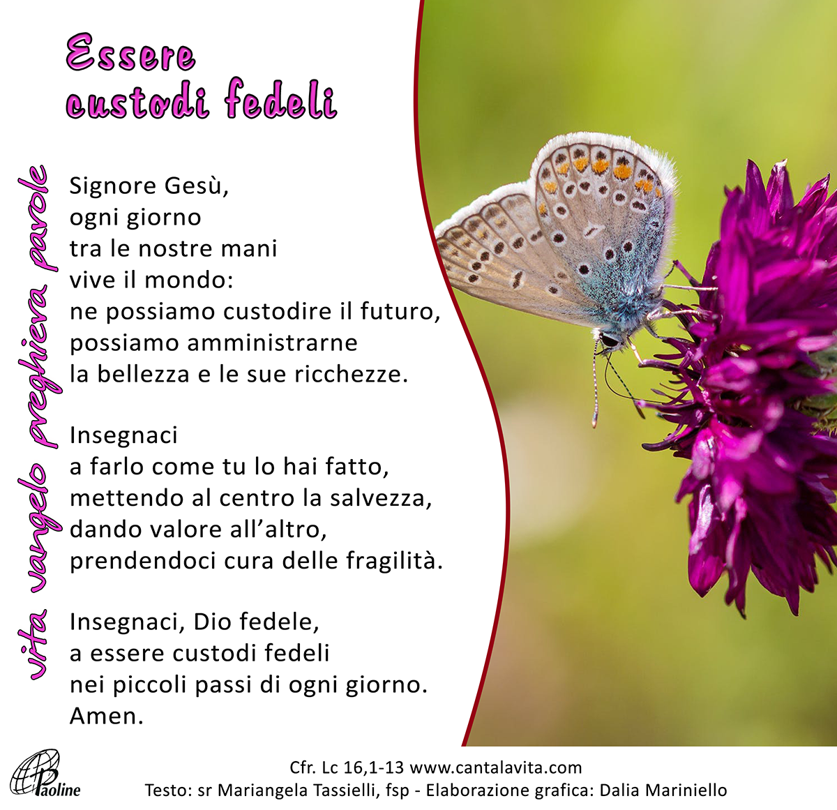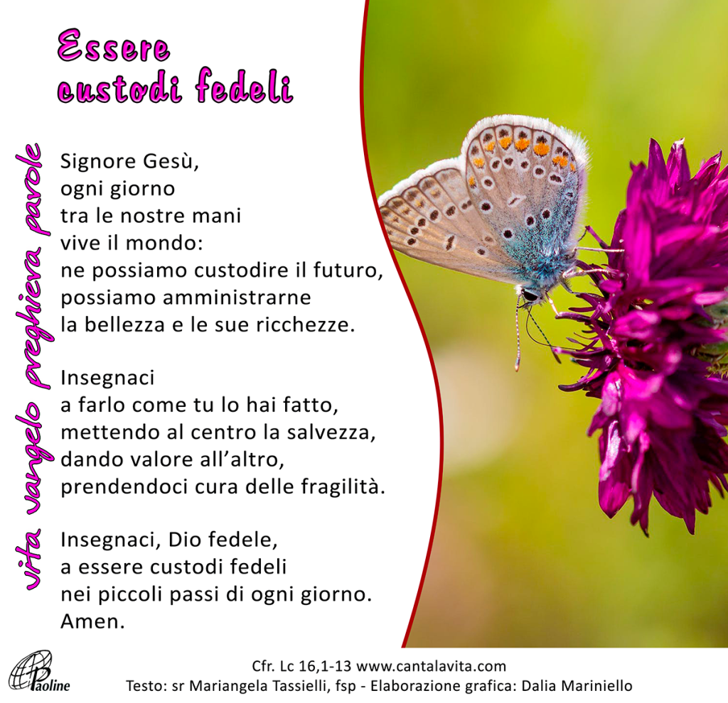 Amministratori e custodi: ecco cosa siamo, nel cuore e nel progetto di Dio. Siamo donne e uomini a cui il Creatore ha affidato il mondo, il suo presente e il suo futuro. Ogni giorno, con coraggio, dovremmo riuscire a dirci, e per questo essere consapevoli, che non siamo in questo mondo per uno strano caso di un impersonale destino. Ciò che facciamo non riguarda solo noi e le nostre cerchie più o meno strette. Tra le nostre mani vive il mondo, nelle nostre mani è stato posto il mondo. E noi siamo proprio come quell’amministratore della parabola che il Vangelo, in questa XXV domenica del Tempo Ordinario, ci propone: siamo coloro che il Signore della vita ha chiamato alla vita, siamo stati posti nel mondo per far vivere il mondo, siamo coloro a cui è stato affidato ciò che Dio stesso considera ricchezza incommensurabile, i suoi figli e figlie, la sua creazione.