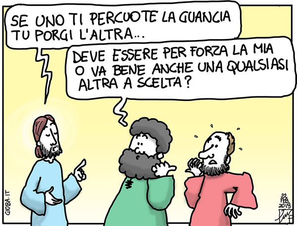 «Avete inteso che fu detto: “Occhio per occhio e dente per dente”. Ma io vi dico di non opporvi al malvagio; anzi, se uno ti dà uno schiaffo sulla guancia destra, tu pórgigli anche l’altra, e a chi vuole portarti in tribunale e toglierti la tunica, tu lascia anche il mantello. E se uno ti costringerà ad accompagnarlo per un miglio, tu con lui fanne due. Da’ a chi ti chiede, e a chi desidera da te un prestito non voltare le spalle.
