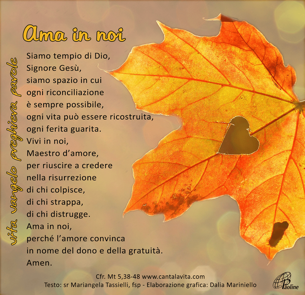Eppure per quanto sia difficile, noi possiamo vivere, possiamo realizzare, possiamo dare concretezza a quanto il Vangelo chiede. Perché? Perché siamo tempio di Dio e Dio stesso vive in noi. Solo per questo. È in lui che ritroviamo continuamente il via. È lui colui che da dentro ci muove, ci cambia, ci trasforma. Ci rende capaci di agire in modo tale da far splendere nella notte oscura delle relazioni la luce del dono e dell’amore.