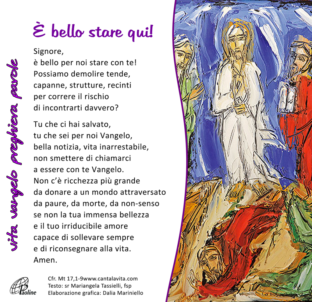 Prendendo la parola, Pietro disse a Gesù: «Signore, è bello per noi essere qui! Se vuoi, farò qui tre capanne, una per te, una per Mosè e una per Elia». Egli stava ancora parlando, quando una nube luminosa li coprì con la sua ombra. Ed ecco una voce dalla nube che diceva: «Questi è il Figlio mio, l’amato: in lui ho posto il mio compiacimento. Ascoltatelo».