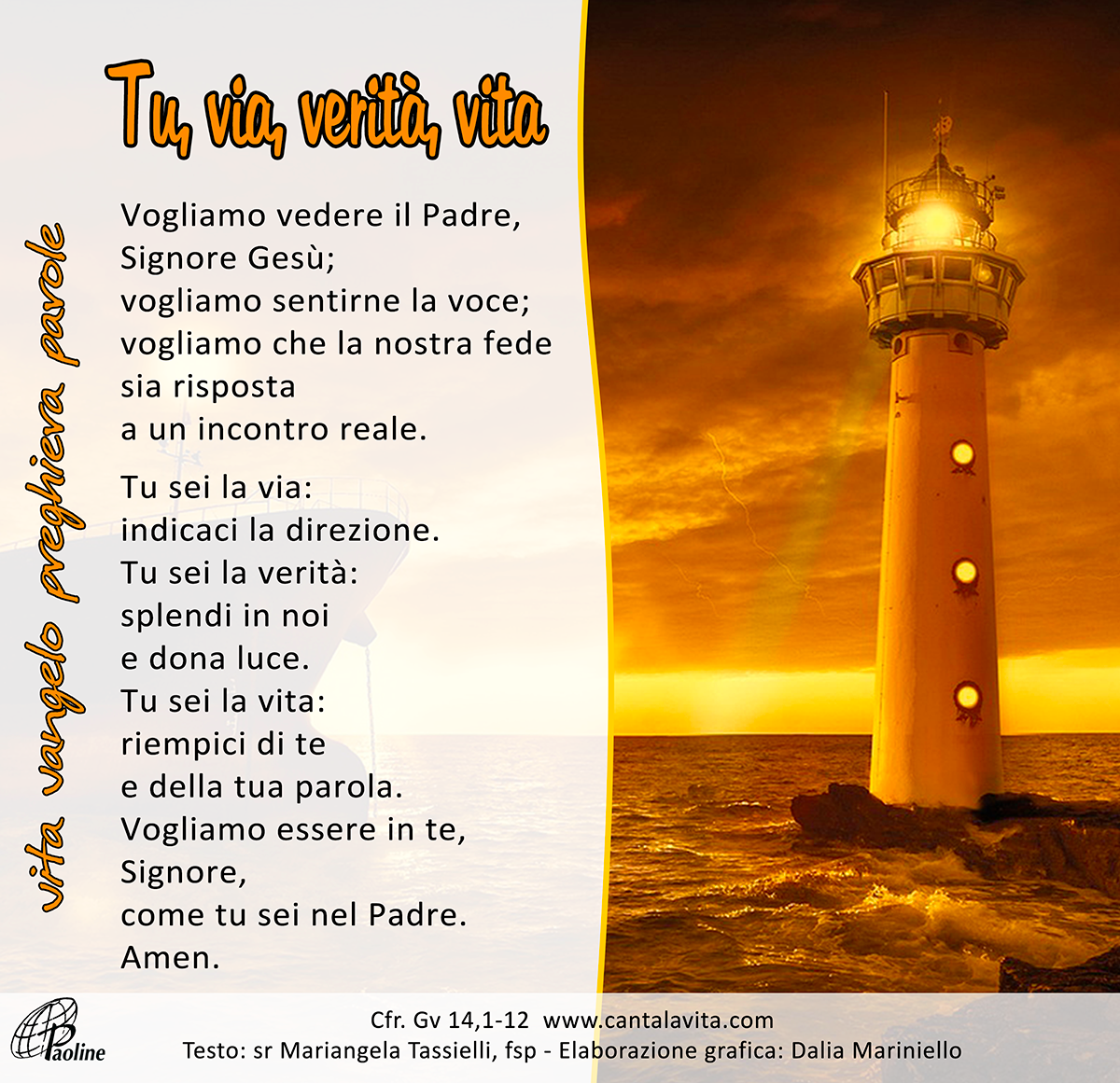 Gli disse Tommaso: «Signore, non sappiamo dove vai; come possiamo conoscere la via?». Gli disse Gesù: «Io sono la via, la verità e la vita. Nessuno viene al Padre se non per mezzo di me. Se avete conosciuto me, conoscerete anche il Padre mio: fin da ora lo conoscete e lo avete veduto».