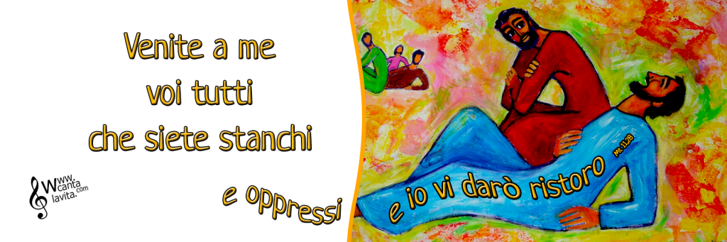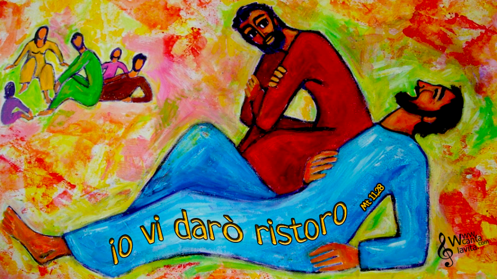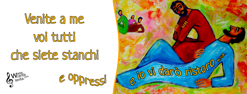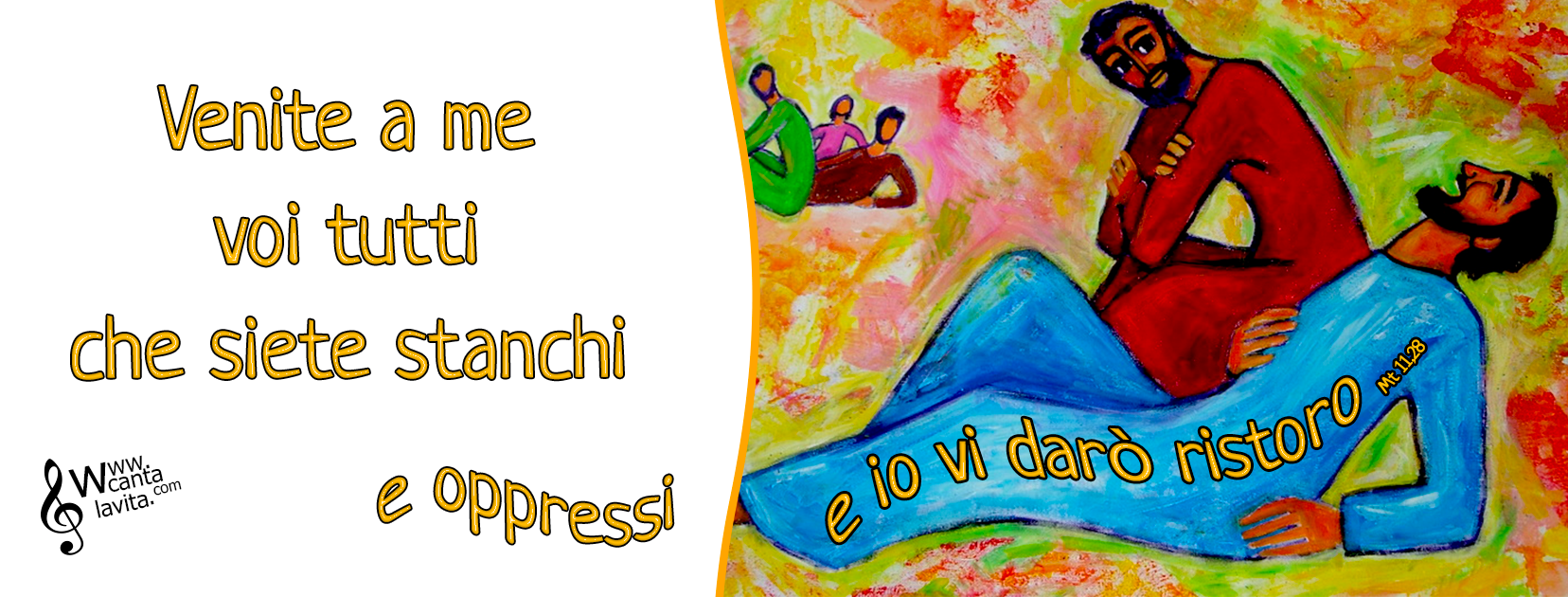 Venite a me, voi tutti che siete stanchi e oppressi, e io vi darò ristoro. Prendete il mio giogo sopra di voi e imparate da me, che sono mite e umile di cuore, e troverete ristoro per la vostra vita. Il mio giogo infatti è dolce e il mio peso leggero».