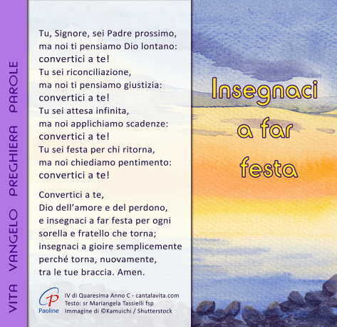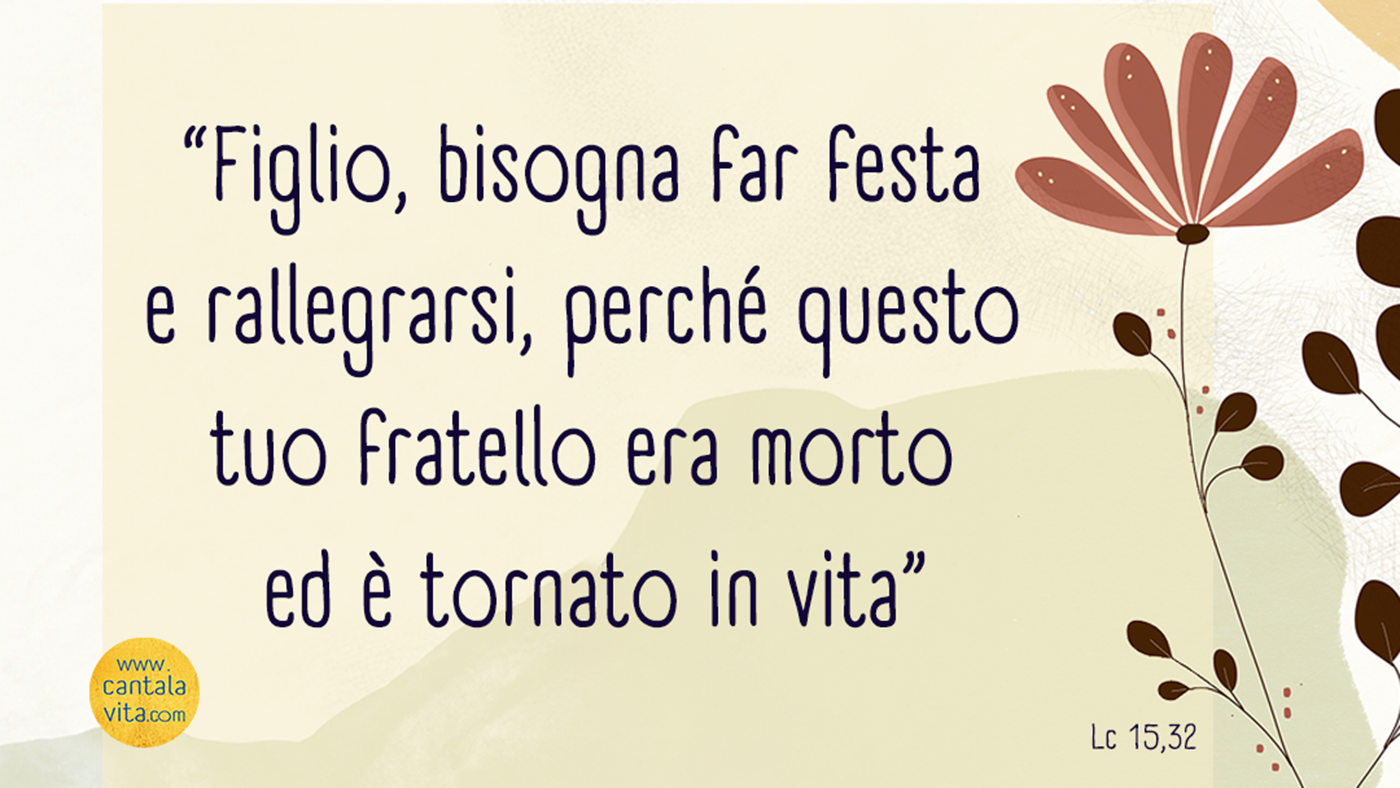 Quando era ancora lontano, suo padre lo vide, ebbe compassione, gli corse incontro, gli si gettò al collo e lo baciò. Il figlio gli disse: “Padre, ho peccato verso il Cielo e davanti a te; non sono più degno di essere chiamato tuo figlio”. Ma il padre disse ai servi: “Presto, portate qui il vestito più bello e fateglielo indossare, mettetegli l’anello al dito e i sandali ai piedi. Prendete il vitello grasso, ammazzatelo, mangiamo e facciamo festa, perché questo mio figlio era morto ed è tornato in vita, era perduto ed è stato ritrovato”. E cominciarono a far festa.