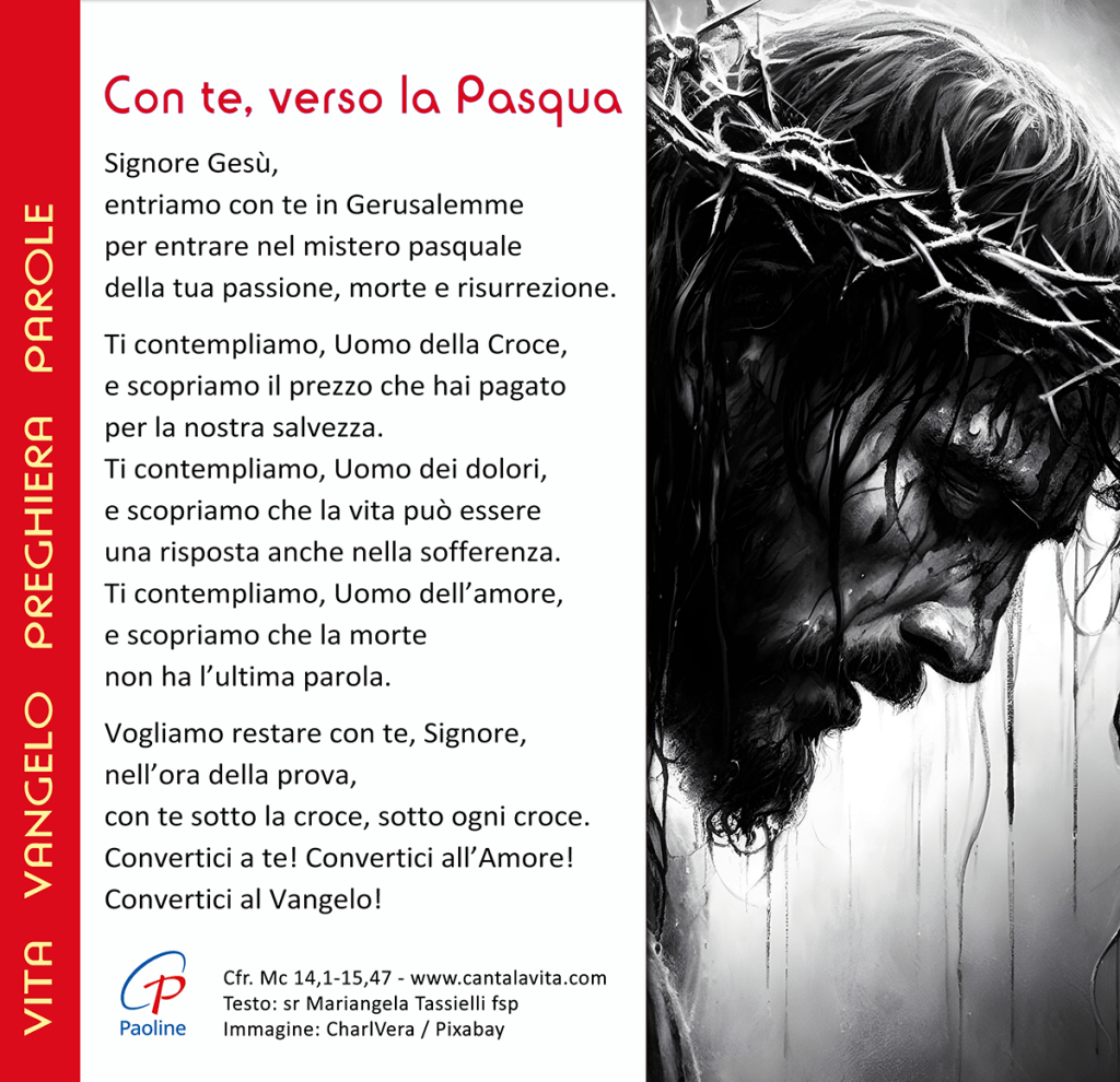 Così si apre il lungo Vangelo di oggi, domenica delle Palme, che ci accompagna nel cuore della Passione del Signore. Si apre abbinando consapevolezza e desiderio: quella consapevolezza e quel desiderio di Gesù che ha segnato ogni suo sì, ogni sua risposta, ogni scelta fino alla croce; quella consapevolezza e quel desiderio che sono anche per ognuna, ognuno di noi una chiamata a una fede autentica, resa vera da scelte quotidiane, tanto ordinarie quanto radicalmente capaci di umanità e vangelo.