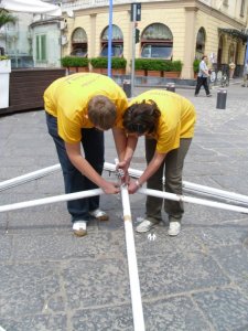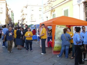 no in chiesa; infine il gruppo a cui io appartenevo e che era situato sotto un padiglione esterno, aveva il compito di chiedere ai giovani usciti dalla chiesa il numero di cellulare e l’e-mail per inviagli l’SMS Vangelo e Buona Domenica, in più ci erano stati dati anche degli inviti da distribuire a chi avessimo incontrato vicino alla chiesa e quindi allo stand coperto.